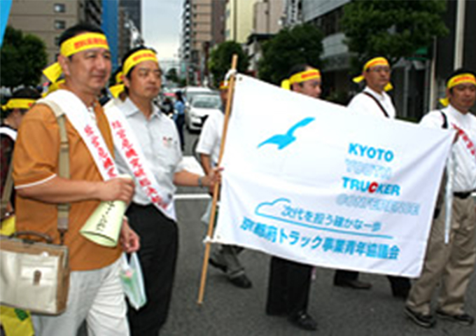 2008年8月26日『燃料高騰経営危機突破総決起大会』を全国2万人の事業者が決起。京ト協では大阪での統一行動に集結し、燃料高騰による業界の窮状を訴えました。